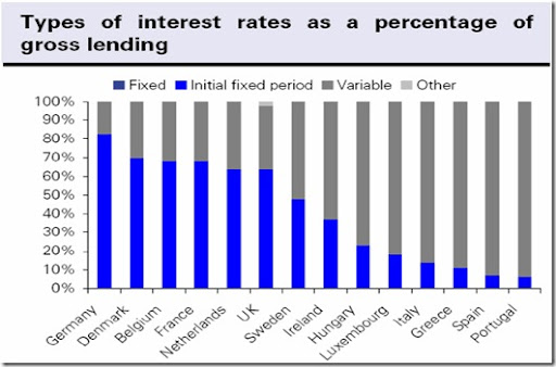 Sto osservando come l'Italia sia al quart'ultimo posto come numero di mutui a tasso fisso in Europa. In compagnia abbiamo Grecia, Spagna e Portogallo.